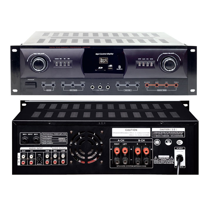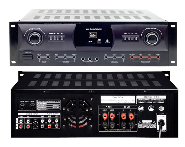 (1)主声道300W*2/(2)带USB/SD,蓝牙,LED屏显示,遥控