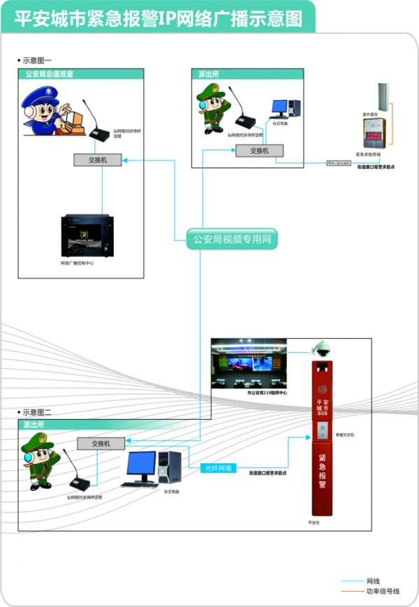 利用平安城市广播系统配合监控系统来使用。即一个监控点配置一个广播点位。并且在涉及公共安全的重要场所如国家机关、学校、银行、街道社区、商业繁华区和治安复杂路段,设置市民对讲警民联系点。使群众在日常生活中如遇重大紧急事件时,可利用本网络向公安机关紧急语音求助,实现警民双向对讲。