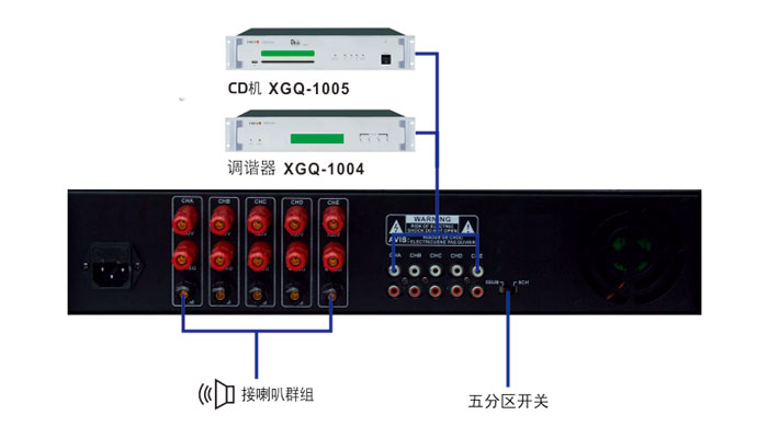 ● 可实现对1组常规广播设备(功放机,VCD.卡座,收音头,发射机等)电源控制和4路广播分区控制。