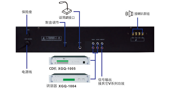 ● 机器异常工作保护警告功能;当输入信号过大、负载过重、线路短路时,;对应的指示灯闪烁提示,有极高的可靠性。
