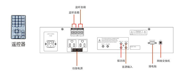 ● 内置一路网络IP解码,立体声音频输岀,可扩展连接四台功率放大器。