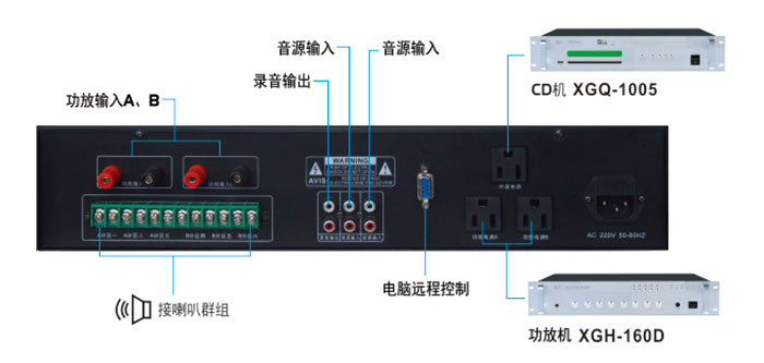● 两个功放电源,手动/自动定时开关控制,一个外设电源,手动/自动定时控制。外设电源可定时外控收音机,CD机电源以扩展系统节目源。