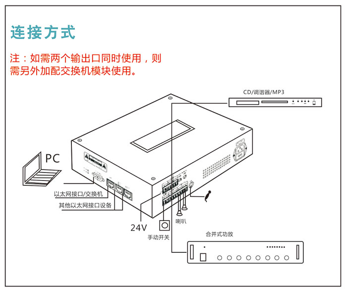 ● 1路音频信号辅助输出接口,可扩展外接功塞放大器,工业级接线端子,采用螺丝固定连接可靠性远高于常规接插件