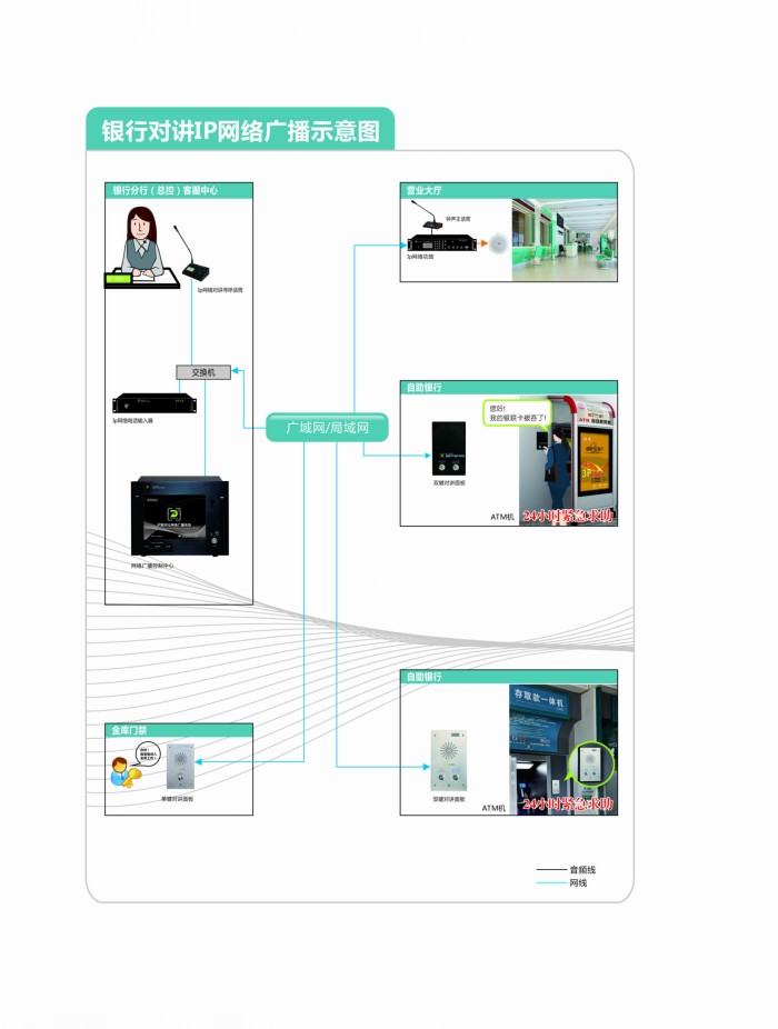 随着社会的进步,科技的发展,金融在社会发展中所起的作用越来越明显,金融行业也显得越来越重要。在现金的大都市,到处都能看到各大银行的营业网点,人们与银行打交道越来越密集,服务这块就遇到了比较大的难题。比如像取款吞卡、取款机没有现钞、甚至遇到危险的情况下以及分行与各个支行之间的实时通话,对所有网点进行网络管理时。我们的IP网络双向对讲广播起到了至关重要的作用。