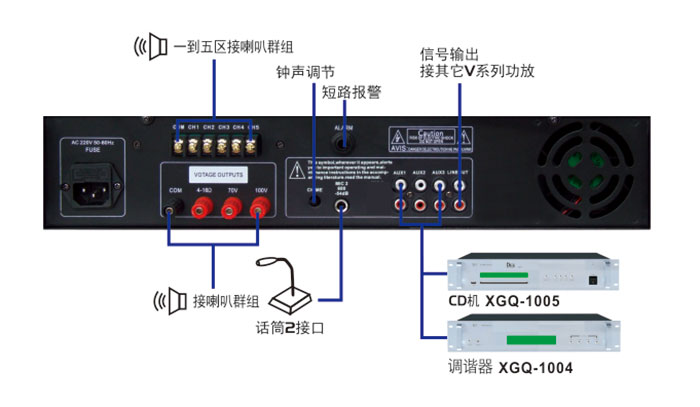 ● 2路话筒输入(MIC1、2);MIC1具有最高优先权,3路线路输入(AUⅩ1、2、3);每一通道均可调节音量