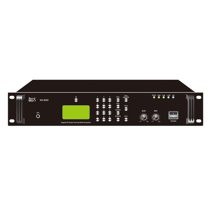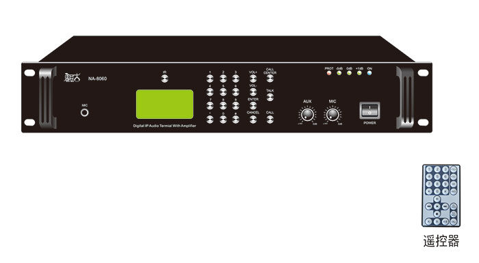 ● 1路本地线路输入,1路话筒输入接口,1路音频輪出,1路232串口输出配置了遥控器,可点播服务器中音频文件,可轻松控制节目的快进、快退,播放、暂停及书签设置:具有顺序、循环、复读等多种播放模式